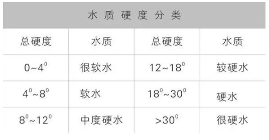 水的硬度,是指水中的鈣、鎂、鐵、鋁、錳的碳酸鹽、重碳酸鹽、氯化物、硫酸鹽及硝酸鹽等所有的鹽類的含量,并常含有汞、鎘、砷、鉛等少量的有害元素。水的硬度單位通常是將水中的全部鹽類換算為碳酸鈣來計量。當(dāng)水中的硬度以碳酸鈣計小于150毫克/升時,稱為軟水;150—450毫克/升時,稱為硬水;450—714毫克/升時為高硬水;大于714毫克/升時為特硬水。國家生活飲用水硬度的衛(wèi)生標(biāo)準(zhǔn)為小于450毫克/升(以碳酸鈣計)。