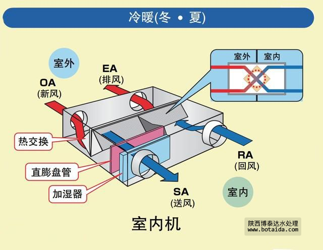 主要部分就是全熱交換機(jī)(機(jī)內(nèi)有過(guò)濾裝置),作用就是將室外空氣吸入經(jīng)過(guò)過(guò)濾和要排出的空氣進(jìn)行熱量交換,使得新風(fēng)口出來(lái)的空氣與室內(nèi)溫度溫差不大,從而達(dá)到舒適度和能耗上良好的效果。
